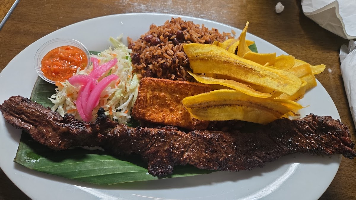 I recently visited Delicias Nicaraguense, a newly opened restaurant that caught my eye. Despite my forgetfulness with the dish's name, I found it to be delicious. I will say the portion size was slightly unbalanced ratio of main course to sides like rice, beans, and plantains. I would’ve liked to see more of the main dish on my plate. The tostones were a standout, surpassing my expectations. I suggest offering a half-and-half option for those torn between plantains and tostones. The agua Fresca I ordered was refreshingly sweet. Everything tasted fresh and made to order, and the lively music added to the ambiance. Despite the lack of prices on the menu, the staff promptly addressed the issue and assured they were working on new menus. While my bill exceeded $30, I found it a tad pricey, but the flavors, cleanliness, and ambiance were good. There were plenty of customers coming in and out of the restaurant, indicating a growing curiosity for Nicaraguan cuisine, and I hope Delicias Nicaraguense continues to thrive. Gracias, y buenas suerte en su negocio